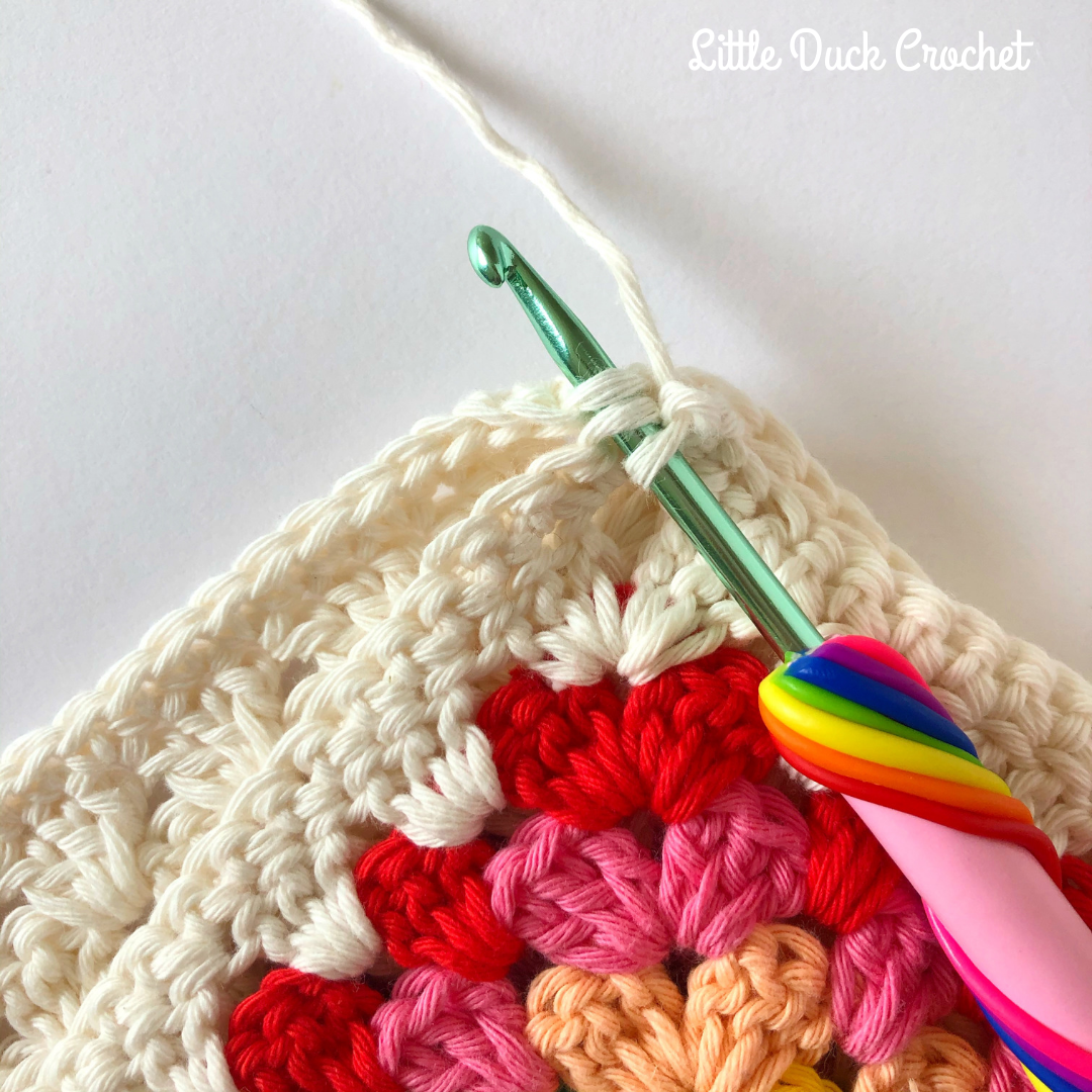 Using the same granny square method as above, make a granny square of 17 rounds, do not break yarn when finished.