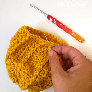 Using a yarn needle, close the top of the stalk up. Insert needle through the back loop of the first sc and then repeat this in the next 5 sc. Gently pull to close, inserting the needle in through the top of the stalk and pulling the tail out the bottom.