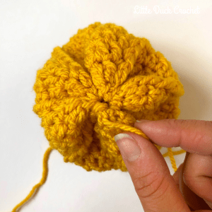 To hide any loose threads, using a yarn needle, insert your hook into the bottom of your pumpkin and pull them through to the other side. Being super careful not to cut your stitches, snip the thread as close to the pumpkin as possible and give it a squish. The ends will then be safely hidden inside!